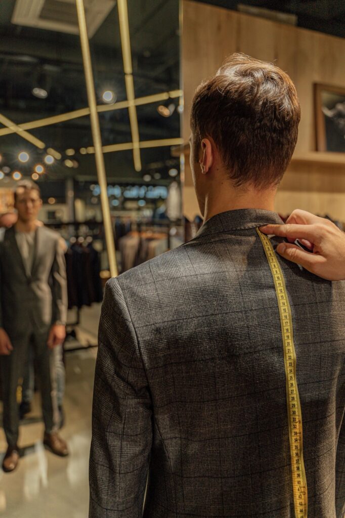 - それぞれに美しく着こなすための合わせるべきポイントがいくつかあります、プロのフィッターは体型に合わせて20~30か所を採寸。